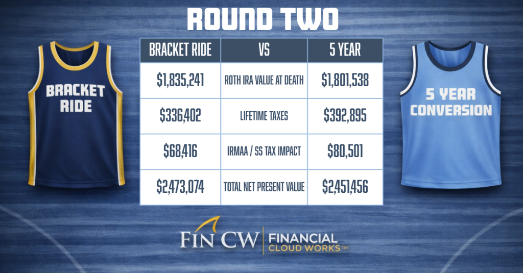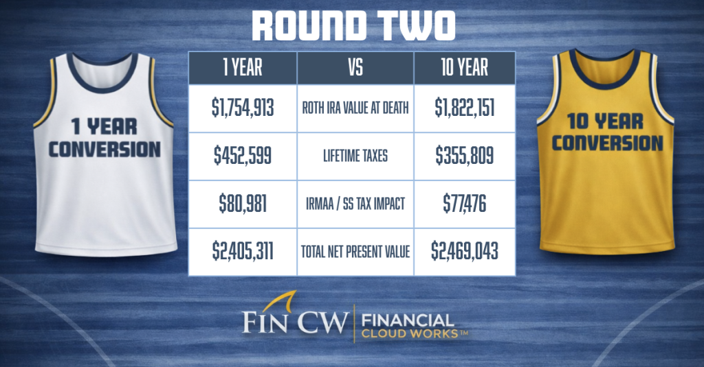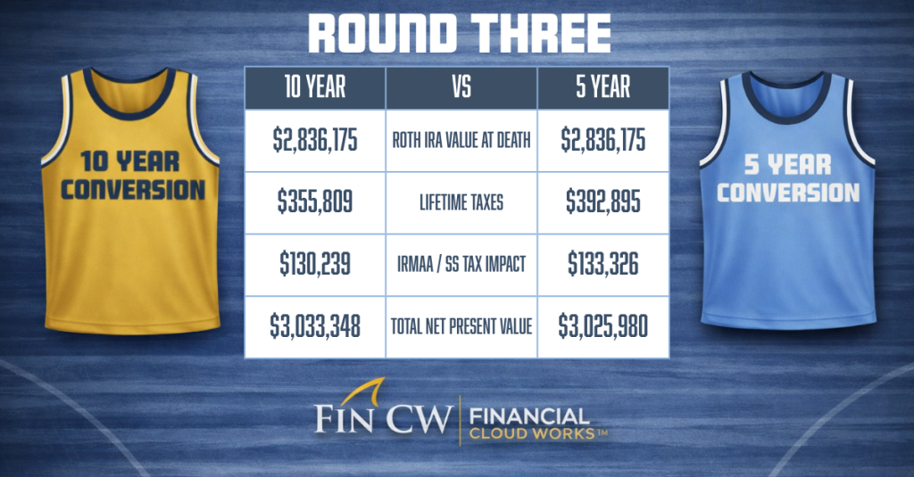 - The 5‑Year Conversion consistently ranked second in the IRMAA and Social Security tax‑impact category across all three rounds, finishing right behind the 1‑Year strategy. Converting over five years did cost the client $37K more in taxes compared to the 10‑Year approach, which is why it never secured a round win. Even so, it remained competitive — taking second place in Total NPV in Round Two and staying within striking distance of the 10‑Year strategy throughout the tournament. It didn’t dominate any single category, but it was never the weakest performer either.