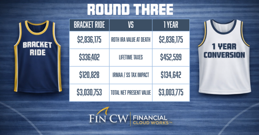 - The 1‑Year Conversion swept the tournament in the IRMAA and Social Security tax‑impact category because the entire conversion was completed long before the client ever entered the IRMAA look‑back window. That early timing eliminated future Medicare surcharges — but it came at a cost. Compressing the entire conversion into a single year created the largest tax spike of any strategy, giving 1‑Year the highest total tax bill in all three rounds.