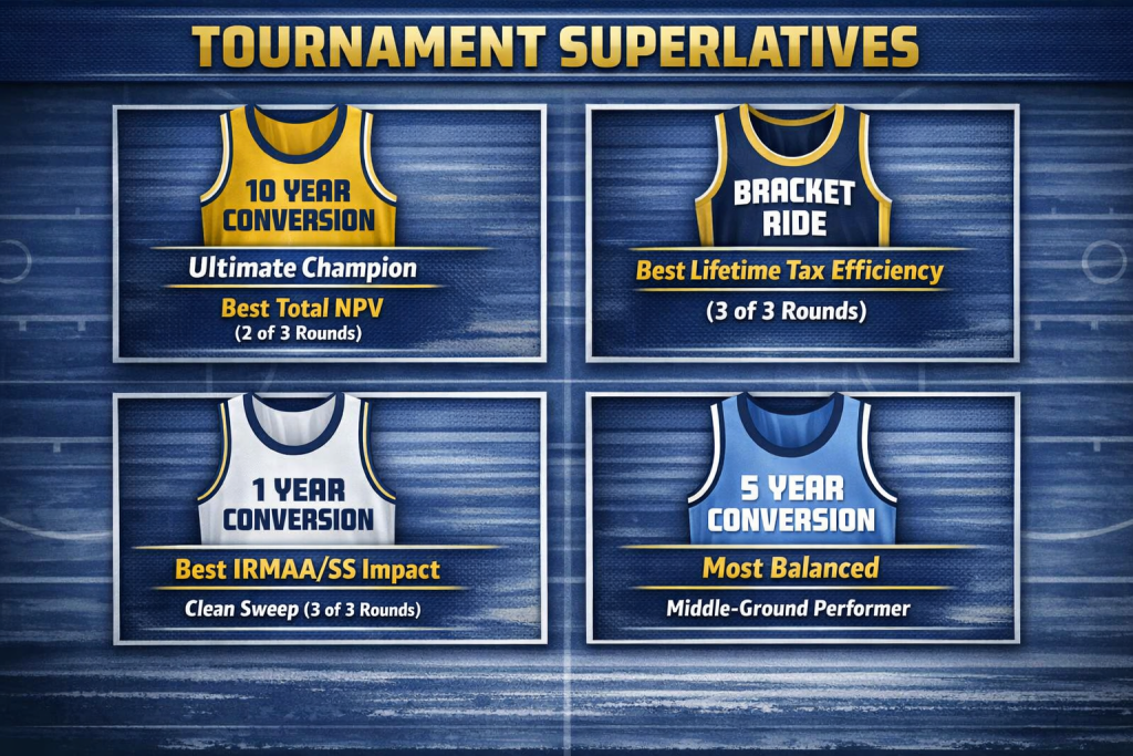 - The 10‑Year Conversion required paying more taxes than Bracket Ride, but its full conversion was completed before Medicare’s two‑year IRMAA look‑back period began. That timing advantage gave it the ultimate edge, securing wins in two of three rounds.